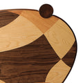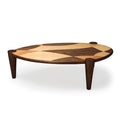 A seamless blend of art and everyday practicality, the Calico Coffee Table livens up a space with its curvy checkered pattern created with carefully inlaid veneer in a calico palette of light ash wood, mid tones, and dark walnut, all adorning a mid-century silhouette held aloft by hefty tapered wooden legs.